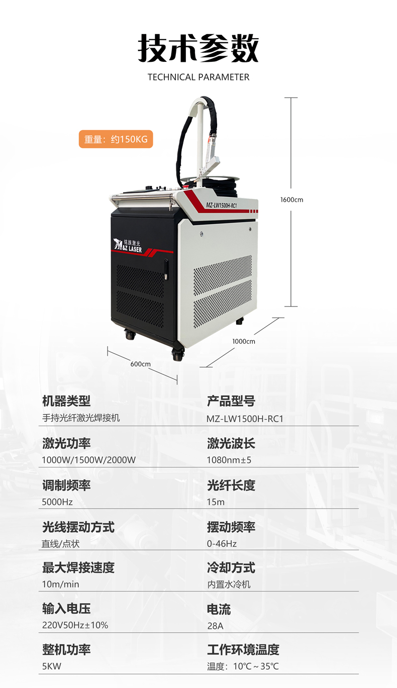 手持式光纖激光焊接機MZ-1000/2000W-RC,采用全新一代光纖北京熱刺/武漢銳科激光器,配置超強擺動焊槍,漢利冷水機。具有操作簡單、焊縫美觀、焊接速度快、無耗材的優勢。填補激光設備行業手持式焊接的空白。手持激光焊接機(圖1)